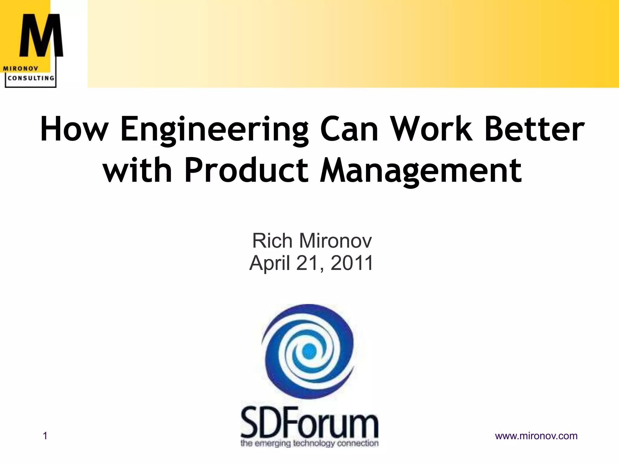 The document discusses the collaboration between engineering and product management, highlighting the roles and responsibilities of product managers in software development. It outlines the challenges faced by product managers, particularly in agile environments, and provides strategies for improving their effectiveness. Additionally, it emphasizes the importance of communication and understanding customer needs in driving successful product outcomes.