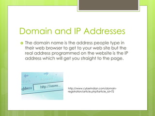 The document discusses several key aspects of how the internet works. It explains that the internet is a global network that provides information and communication worldwide. It describes how domain names provide an easy-to-remember address for websites, while IP addresses are the actual location programmed into the site. Data is sent over the internet in packets that are grouped, travel along a network path, and are reassembled at their destination. Routers help determine where to send information packets and allow internet signals to travel between thousands of devices connected to the network.