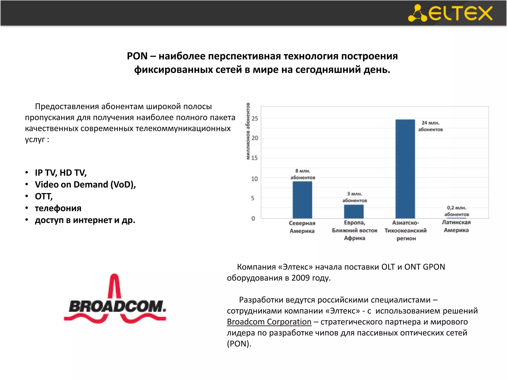Документ описывает оборудование для построения пассивных оптических сетей (XPON) компании "Элтекс", включая решения GPON и TurboGPON, которые обеспечивают широкую полосу пропускания для телекоммуникационных услуг. Рассматриваются различные модели оборудования, включая OLT и ONT с поддержкой интегрированных функций, таких как Wi-Fi и мультимедиа-сервисы. Также упоминаются партнерские проекты с крупными операторами и достижение значительных масштабов в реализации сетей.