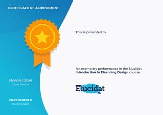 This certificate recognizes Charles Ostle for exemplary performance in an Introduction to Elearning Design course. It is presented by the course director Georgie Cooke and Steve Penfold, the CEO and founder of the organization. The certificate honors Charles Ostle for his achievement in the course.