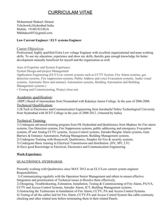 Mohammed Shakeel Ahmed is an ELV/Low current systems engineer from Hyderabad, India seeking new opportunities. He has over 4 years of experience in designing, installing, testing and commissioning various ELV systems including fire alarms, CCTV, access control and building automation. He is proficient in system design, project management, and technical training. He holds a B.Tech in Electronics and Communication Engineering and has undergone additional training programs in fire safety, security and electrical systems.