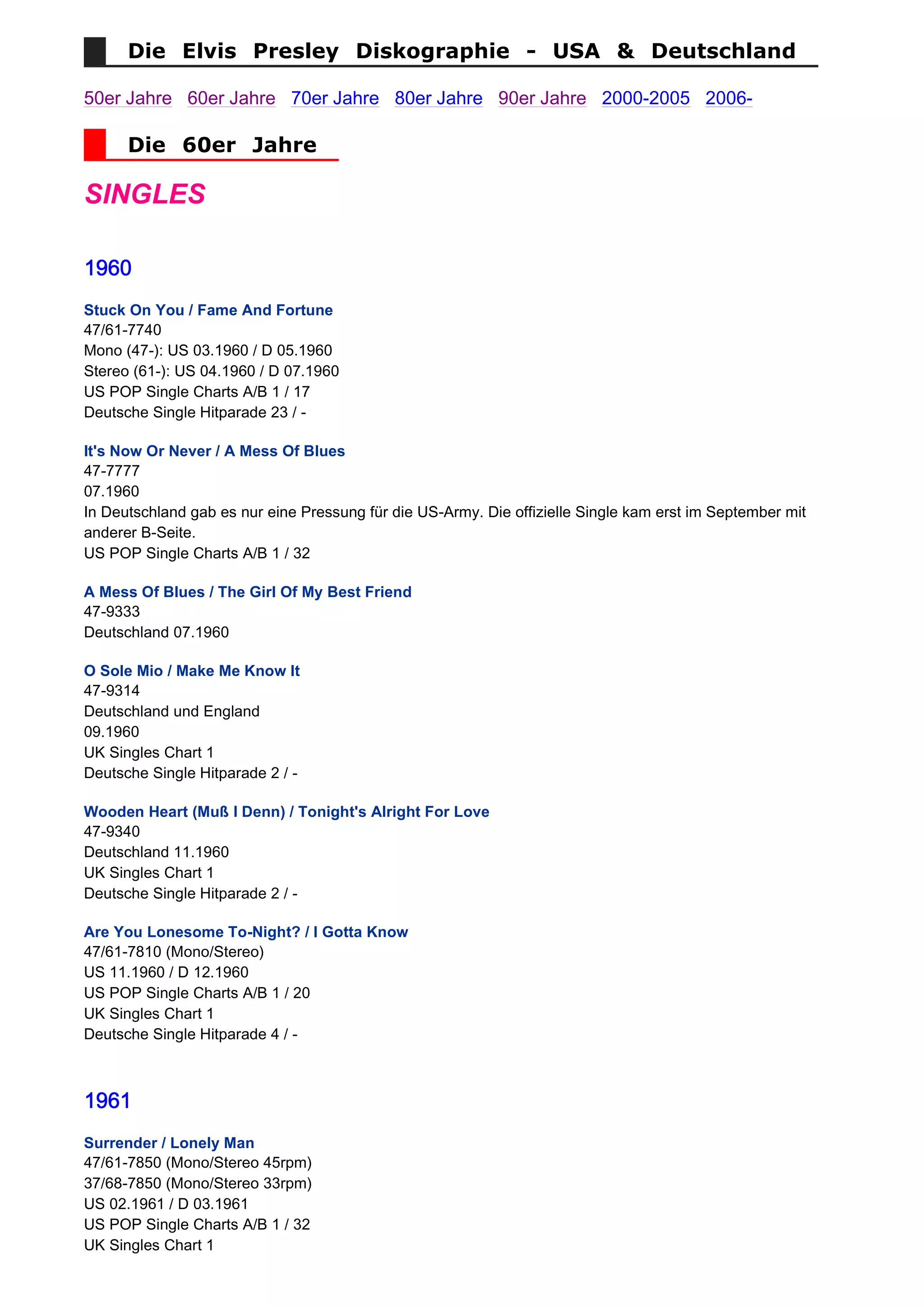 This document provides a detailed discography of Elvis Presley's singles, EPs, and albums released in the United States and Germany from the 1950s through the 1960s. It lists all of his commercially released songs and records for each year, including chart performance data. The discography shows Elvis Presley's immense commercial success and popularity as a recording artist during this time period across multiple formats and countries.