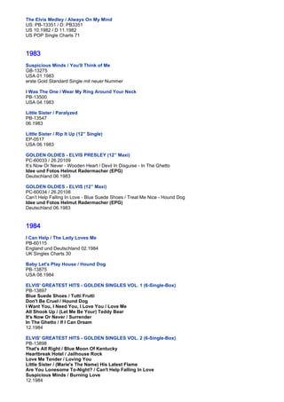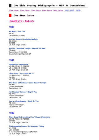 This document provides a listing of Elvis Presley singles and albums released in Germany and the United States from 1980 to 1989. It includes the song titles, catalog numbers, release dates and chart positions of numerous singles and compilation albums, with the majority being released during the 1980s.