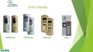The document discusses the features of the 2Wire+ intercom system. It can connect up to 484 entry panels and 6,400 apartment stations across multiple systems. It offers a wide range of entry panels, apartment stations, and system modules. Programming options allow for customization of access controls, button mapping, messaging and more.