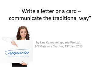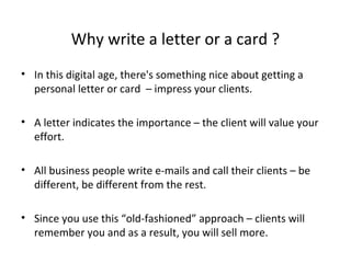 The document recommends writing letters or cards to clients as a way to stand out from other businesses that primarily communicate digitally. It suggests that handwritten notes show clients they are important and will help the writer be remembered, potentially leading to increased sales. Specifically, the document recommends sending seasonal greeting cards to make an impression without discussing business, invitation cards for client events that provide short, simple event details, and letters when launching new products to highlight major facts to follow up on later. It closes by noting letters and cards should maintain a formal tone.