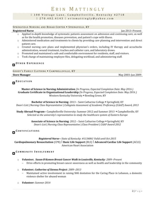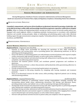 Erin Mattingly is a registered nurse seeking a nursing management position. She has over 5 years of experience as a staff nurse in progressive care units and surgical/telemetry floors. Currently, she is pursuing a Master's degree in Nursing Administration and a graduate certificate in Organizational Leadership from Western Kentucky University. Erin is skilled in patient care, treatment planning, regulatory compliance, and staff supervision. She aims to utilize her clinical expertise and management skills to provide quality care and lead healthcare teams.