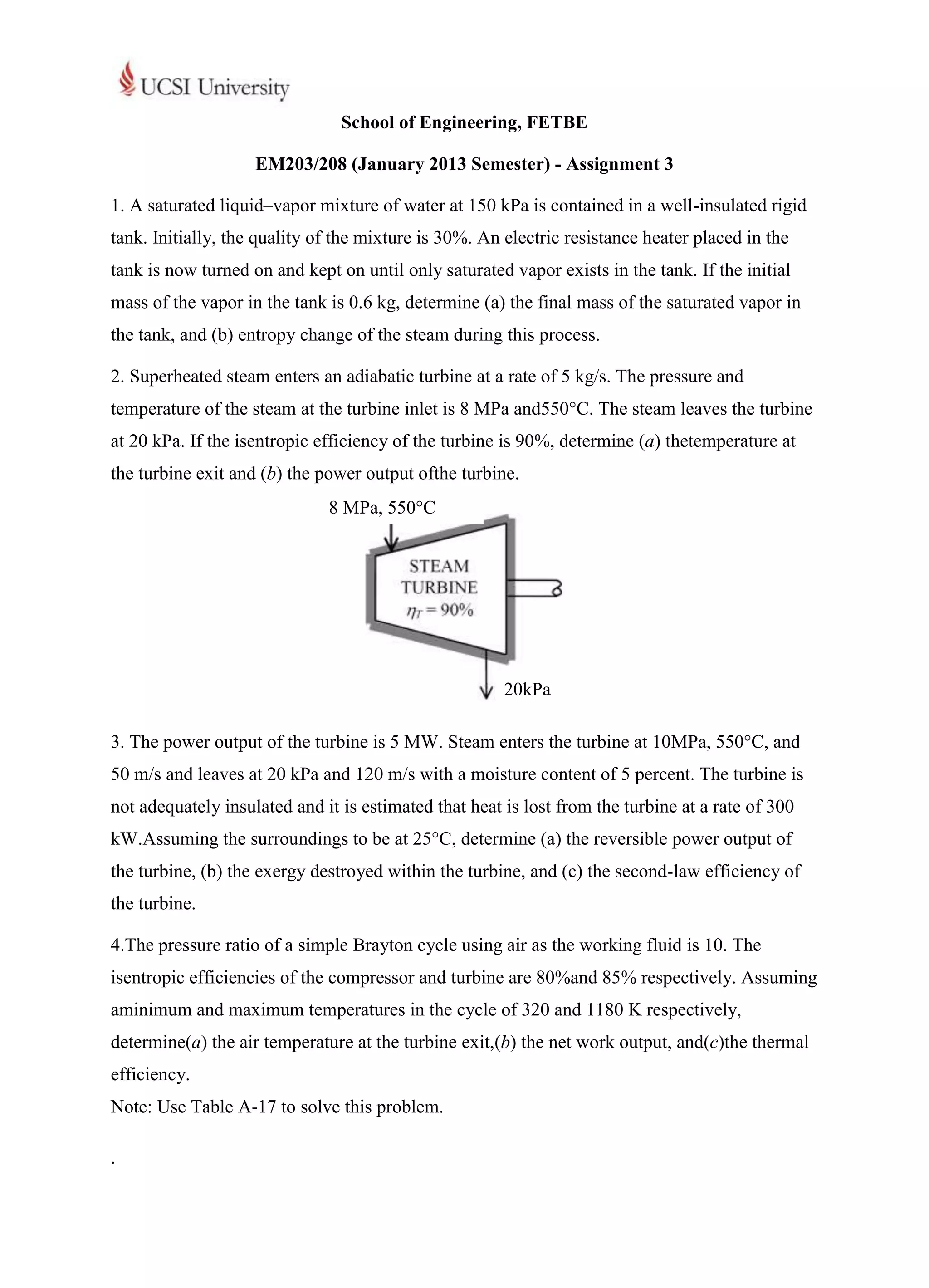 The document contains 4 multi-part engineering problems related to thermodynamics. Problem 1 asks about the mass and entropy change of steam in a tank heated from an initial quality of 30% to saturated vapor. Problem 2 asks about the exit temperature and power output of an adiabatic steam turbine. Problem 3 asks about the reversible power, exergy destroyed, and efficiency of a steam turbine given input/output conditions and heat loss. Problem 4 asks about temperatures, work, and efficiency of a Brayton cycle air turbine given temperatures and efficiencies.