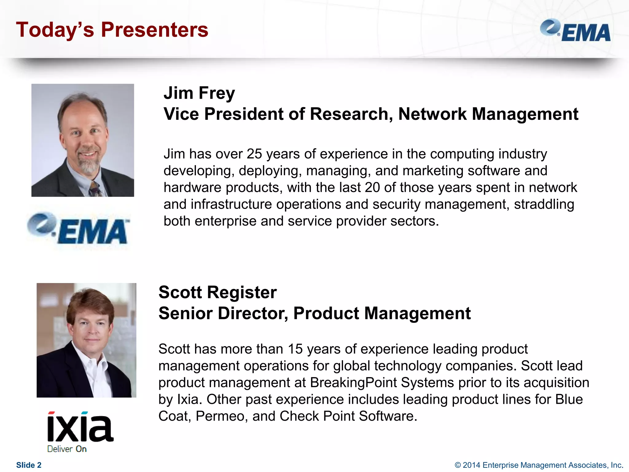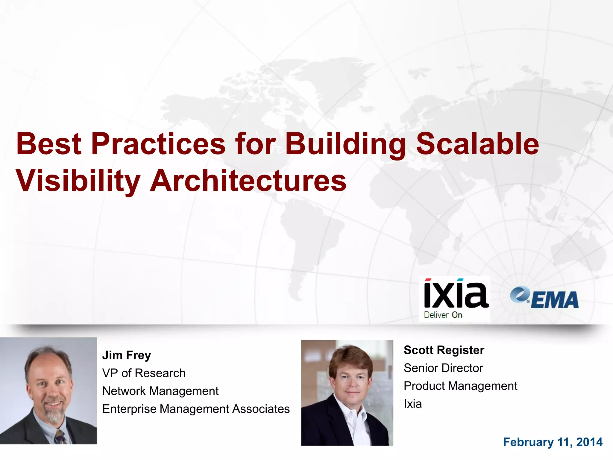 The document outlines best practices for building scalable visibility architectures, presented by experts Jim Frey and Scott Register. It covers key definitions, components, and the importance of visibility architecture in managing network traffic for performance and security operations. The webinar emphasizes the need for adaptive and resilient infrastructures due to the rapid growth of network traffic and tools.