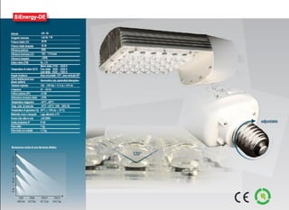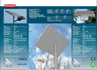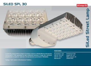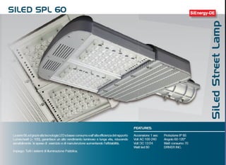 Il documento discute l'implementazione delle lampade stradali LED Siled come soluzione per ridurre le emissioni di gas serra e migliorare l'efficienza energetica. Le lampade LED Siled offrono una durata di 50.000 ore, un risparmio energetico fino al 70% e una qualità della luce superiore rispetto alle lampade tradizionali, contribuendo così a maggior sicurezza stradale. Inoltre, il loro utilizzo riduce l'inquinamento luminoso e non comporta l'uso di metalli pesanti, rendendole ecologiche e più convenienti a lungo termine.