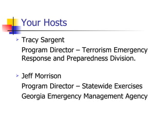 This document summarizes a workshop on the Homeland Security Exercise and Evaluation Program (HSEEP). It defines exercises as simulated events that require participants to function as expected in real events. Exercises are used to test plans and improve coordination. HSEEP provides standardized guidance for designing, developing, conducting and evaluating exercises to build emergency management capabilities. It describes a progressive "building block" approach using discussion-based and operations-based exercises of increasing complexity. Organizations must follow HSEEP requirements including developing annual training plans and submitting after-action reports.