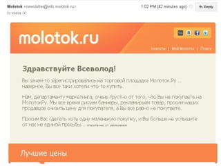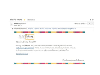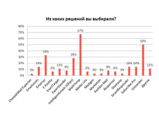 Документ обсуждает проблемы и тенденции email-маркетинга в России, включая недостаток персонализации, низкий уровень доверия к рассылкам и высокую активность спамеров. Также рассматриваются методы сегментации и привлечение подписчиков, а также важность создания привлекательного контента и гибкой системы взаимодействия с аудиторией. Приводятся примеры успешных практик и стратегии, применяемые для повышения эффективности email-рассылок.