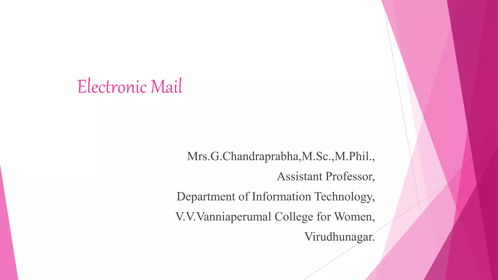 Electronic mail (email) has been in use for over three decades. The document provides an overview of the key components and processes that make up an email system. It discusses the architecture, which consists of user agents that allow people to read and send email, and message transfer agents that move messages between servers. Messages are sent between agents in a standard format defined by RFC 5322 and extended by MIME. The Simple Mail Transfer Protocol (SMTP) is used to transfer messages between agents over the internet.