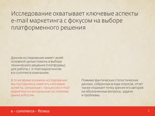 Документ представляет собой обзор и руководство по e-mail маркетингу в России, обсуждая ключевые аспекты выбора платформ и текущие тенденции на рынке. Он подчеркивает потенциал e-mail маркетинга как эффективного канала для увеличения продаж и формирования лояльности, а также описывает статус платформ и стратегий их внедрения. В документе также рассматриваются доступные платформенные решения и их функциональные возможности, что позволяет компаниям выбрать оптимальный вариант для своих нужд.