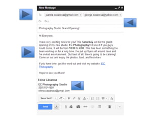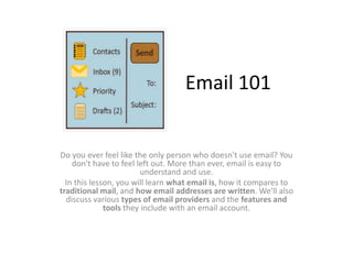 This document provides an overview of email basics. It discusses what email is, how email addresses are structured, and common email providers. It also describes the key components of an email interface, including the inbox, message pane, and compose pane. Finally, it explains common email fields and terms like the To: field, Cc:, Bcc:, body, and signatures.