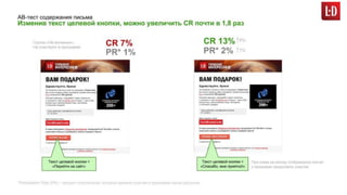 Документ обсуждает проблемы и стратегии e-mail маркетинга, включая изменения в экономике, методы сбора контактов и важность персонализации. Основное внимание уделяется вопросам создания эффективных рассылок, тестирования и измерения результатов, а также законодательным требованиям и рискам, связанным с отписками. Важно не только привлечение новых клиентов, но и удержание существующих через качественные коммуникации и стратегический подход.