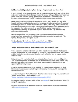 Modernism Week is hosting a self-guided tour of Palm Springs neighborhoods on October 12th to showcase mid-century modern homes and raise money for neighborhood organizations. The tour will drive through quintessential mid-century neighborhoods like Vista Las Palmas and Little Araby, with one or two homes open for interior viewing. Modernism Week is also hosting an "Aloha, Modernism Week" beach party on October 10th at The Hacienda Cantina & Beach Club, with Hawaiian dancers, tiki cocktails, appetizers, and a screening of "Blue Hawaii" on an outdoor movie screen to celebrate Elvis Presley's 80th birthday. Tickets for both events can be purchased on modernismweek.com.