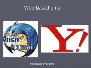 Web-based email, also known as webmail, refers to email services accessed through a web browser rather than an email client. Some popular webmail providers include Gmail, Yahoo Mail, and Hotmail. Webmail has advantages like accessibility from any internet-connected computer and not taking up disk space like desktop email clients. However, webmail also has disadvantages like needing an internet connection to access emails and not allowing the use of desktop email clients. Desktop email clients have advantages like always being able to access emails with just an internet connection and being able to use multiple computers without compromising the ability to see all messages. But desktop email clients also have disadvantages such as taking up disk space and not providing built-in virus protection.