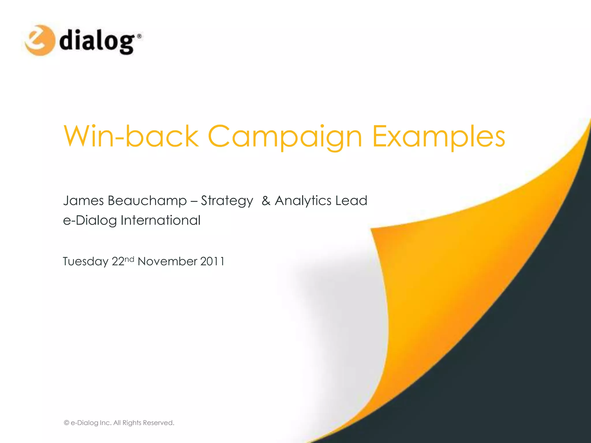 This document provides examples of win-back campaigns from various companies to reactivate inactive subscribers. It discusses targeting lapsed purchasers and undeliverable opt-ins. The examples encourage subscribers to reengage through incentives, emphasizing benefits, and setting deadlines. Alternative communication channels like direct mail, SMS, and on-site banners are also suggested to reach undeliverable subscribers. The document stresses understanding the target audience and desired response, as well as learning more about inactives through surveys to improve win-back programs.