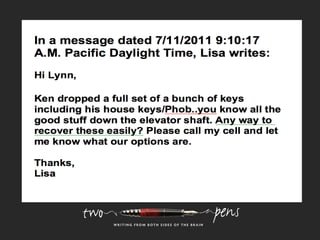 This document discusses best practices for effective email communication through a series of tips and examples. It notes that email is prone to miscommunication because people are multi-tasking and responding quickly. It recommends keeping subject lines and endings clear so the purpose and desired action are obvious. Specific tips include using subject lines to indicate what the email is about, picking up the phone for complex issues, and clarifying responses in a new color when replying to avoid thread tangles. The overall message is that following some basic rules can improve email effectiveness and prevent misunderstandings.