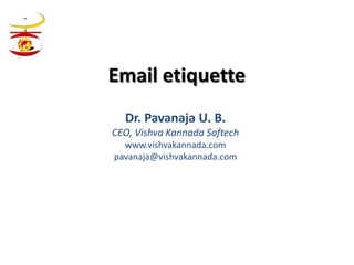 The document outlines email etiquette under the guidance of Dr. Pavanaja U. B., CEO of Vishva Kannada Softech, emphasizing the importance of professionalism, efficiency, and risk protection in email communication. It covers key aspects such as appropriate salutations, subject lines, distinctions between 'to', 'cc', and 'bcc', and the importance of content clarity and conciseness. The document also highlights common dos and don'ts in email communication, providing practical advice for different contexts such as job applications and professional correspondence.