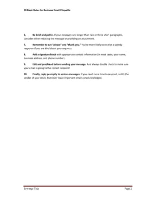 The document provides 10 rules for effective business email etiquette. The rules include writing a clear and specific subject line, placing the main point in the opening sentence, avoiding vague language like "this", using appropriate capitalization and avoiding all caps, being brief and polite, adding a signature with contact information, proofreading before sending, and promptly replying to or acknowledging important messages. Following these rules will help business analysts communicate professionally via email.