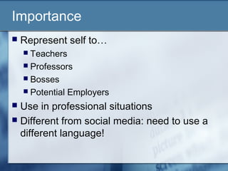 The document discusses the importance of email etiquette in professional settings, emphasizing the need for a respectful tone, appropriate subject lines, and neutral email addresses. It highlights common pitfalls in email communication and offers examples of improved email practices for students communicating with teachers and professors. The document also provides guidance on writing concise emails, using attachments correctly, and specific situations when an email may not be the best form of communication.