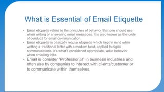 This document discusses email etiquette and its importance in professional communication. It provides guidelines for both writing and responding to emails appropriately. Some key points include: