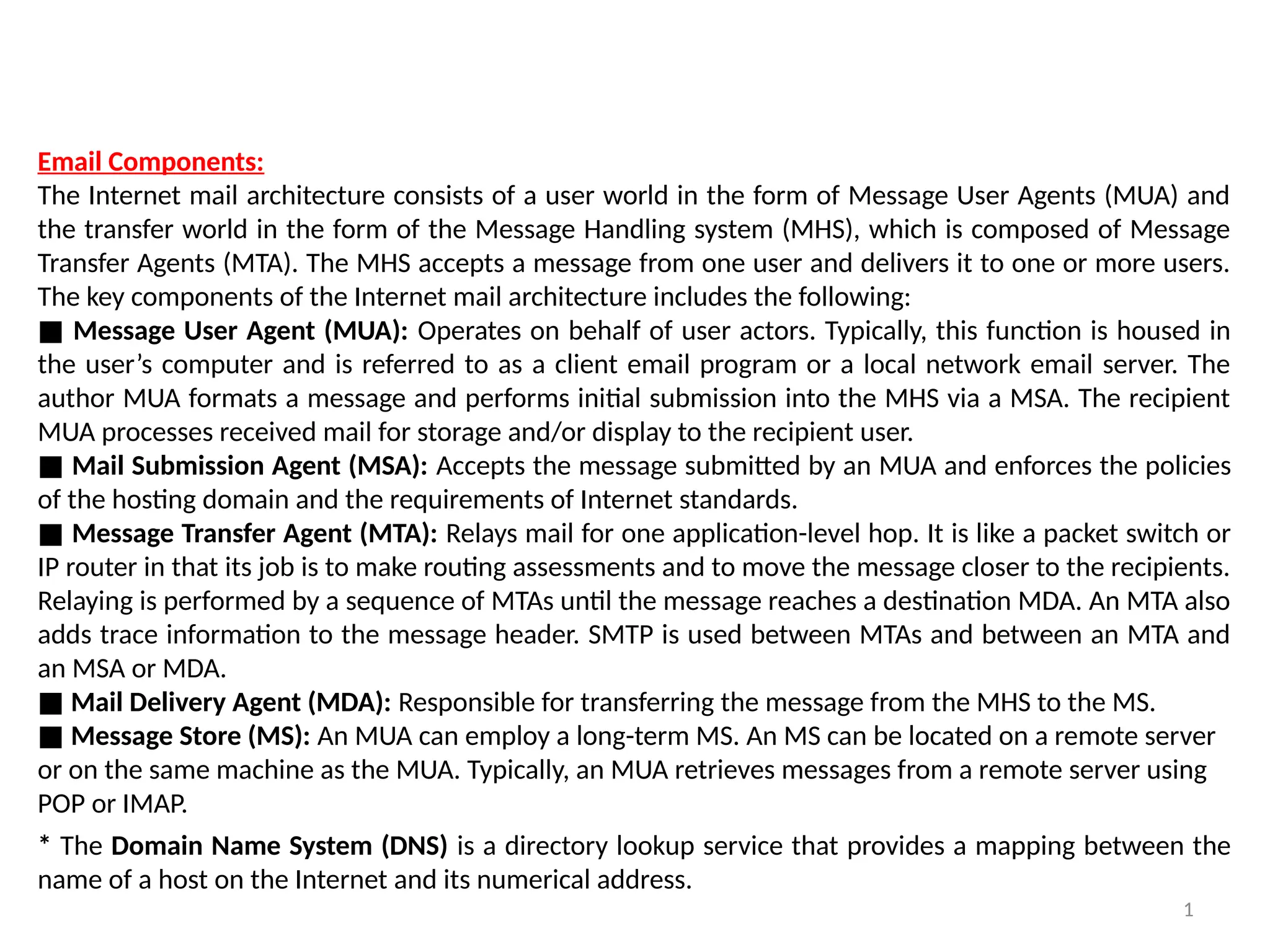 ■ Mail Delivery Agent (MDA): Responsible for transferring the message from the MHS to the MS.
