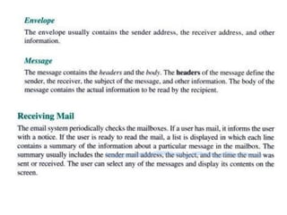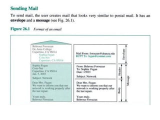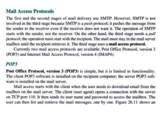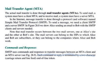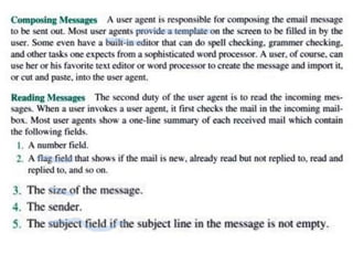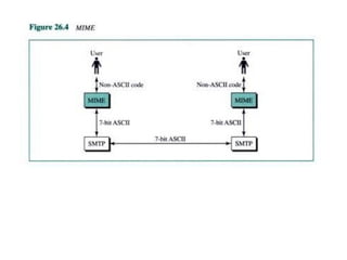 Electronic mail can be forwarded to third parties and is handled through user mailboxes like inbox and outbox. Early systems were command-based while newer ones have a graphical user interface. MIME allows non-ASCII content to be encoded and sent via email. POP3 and IMAP4 are protocols for accessing email on a server, with IMAP4 providing more folder organization and preview features than POP3. When sending email between different systems, user agents and mail transfer agents are needed on both the client and server sides.