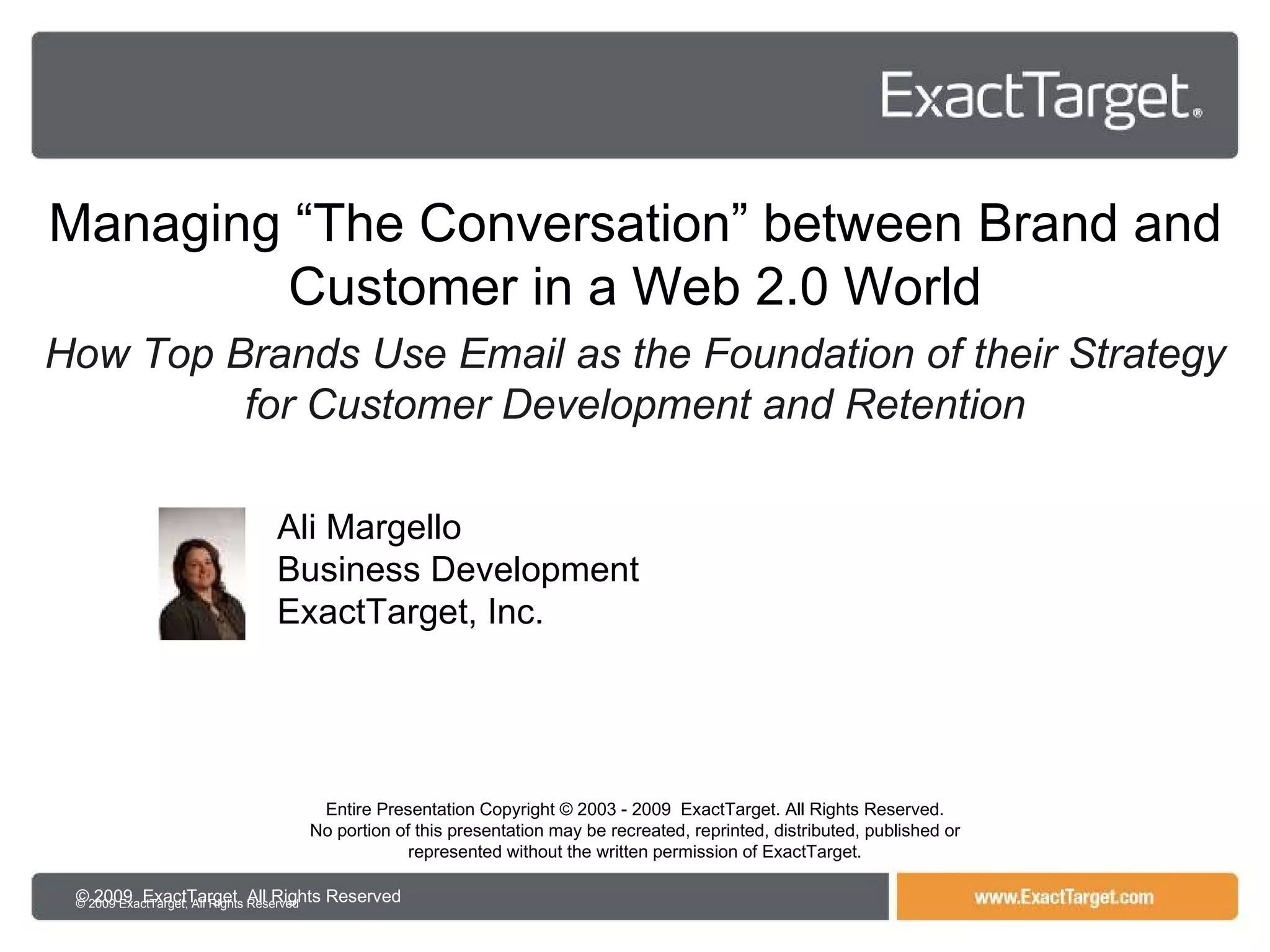 This document discusses how brands can use email as the foundation of their customer relationship strategy in a Web 2.0 world where consumers are exposed to many advertising messages across multiple channels. It provides statistics that show email has the highest return on investment of any digital marketing channel and explains how top brands drive email relevance and performance through personalization, segmentation, behavioral targeting, and real-time content optimization.