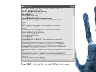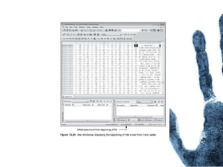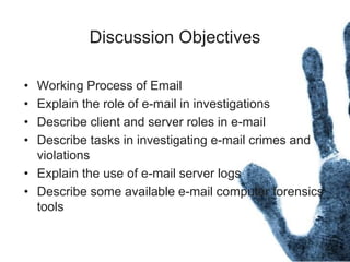 The document outlines the processes and techniques involved in email investigations, including understanding email architecture, roles of clients and servers, and methods to examine, recover, and analyze email evidence. It covers various crime types facilitated by email, tools for email forensics, and emphasizes the importance of tracking email headers and server logs. Additionally, it highlights the challenges related to deleted emails and the utility of advanced forensic tools in recovering such data.