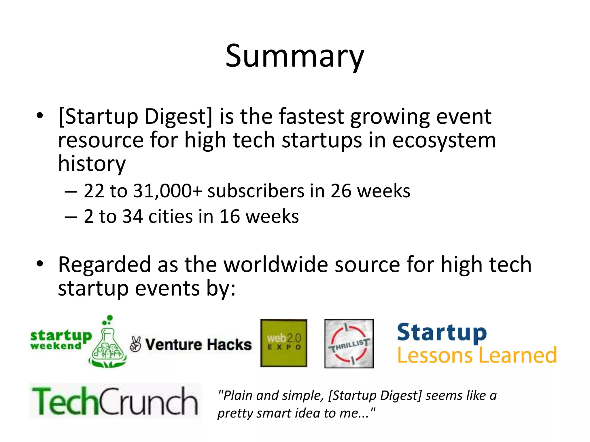 The document discusses the growth and strategy of Startup Digest, an email newsletter for tech startups. It grew from 22 to over 31,000 subscribers in 26 weeks and expanded from 2 to 34 cities in 16 weeks. The document provides tips for email campaigns, including making emails personal, ensuring opt-ins, adding value for subscribers, and presenting exclusive content. It argues that email remains an important channel for reaching customers directly and personally.