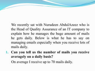 Nurudeen AbdulAzeez receives around 70 emails daily as Head of Quality Assurance for an IT company. He acknowledges emails immediately if a quick response is needed and responds to others by the end of the day if not urgent. When on leave, he sets an automatic out-of-office reply to notify senders and delegates authority to another person to handle emails. Upon returning, any emails received are for information only. He sorts emails into folders by priority and urgency to ensure the most important are addressed first.