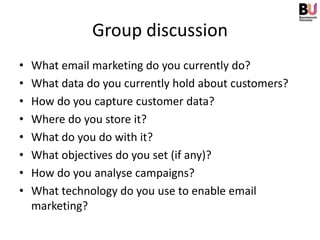 This document provides an introduction to email marketing. It discusses why email is an effective marketing channel, outlines best practices for email marketing campaigns, and reviews key metrics and technologies used for email marketing. Some of the topics covered include capturing customer data, setting campaign objectives, analyzing results, ensuring deliverability, writing effective subject lines and content, and tips for successful email marketing. The document emphasizes the importance of personalization, relevance, permission-based lists, and ongoing testing and improvement of email campaigns.