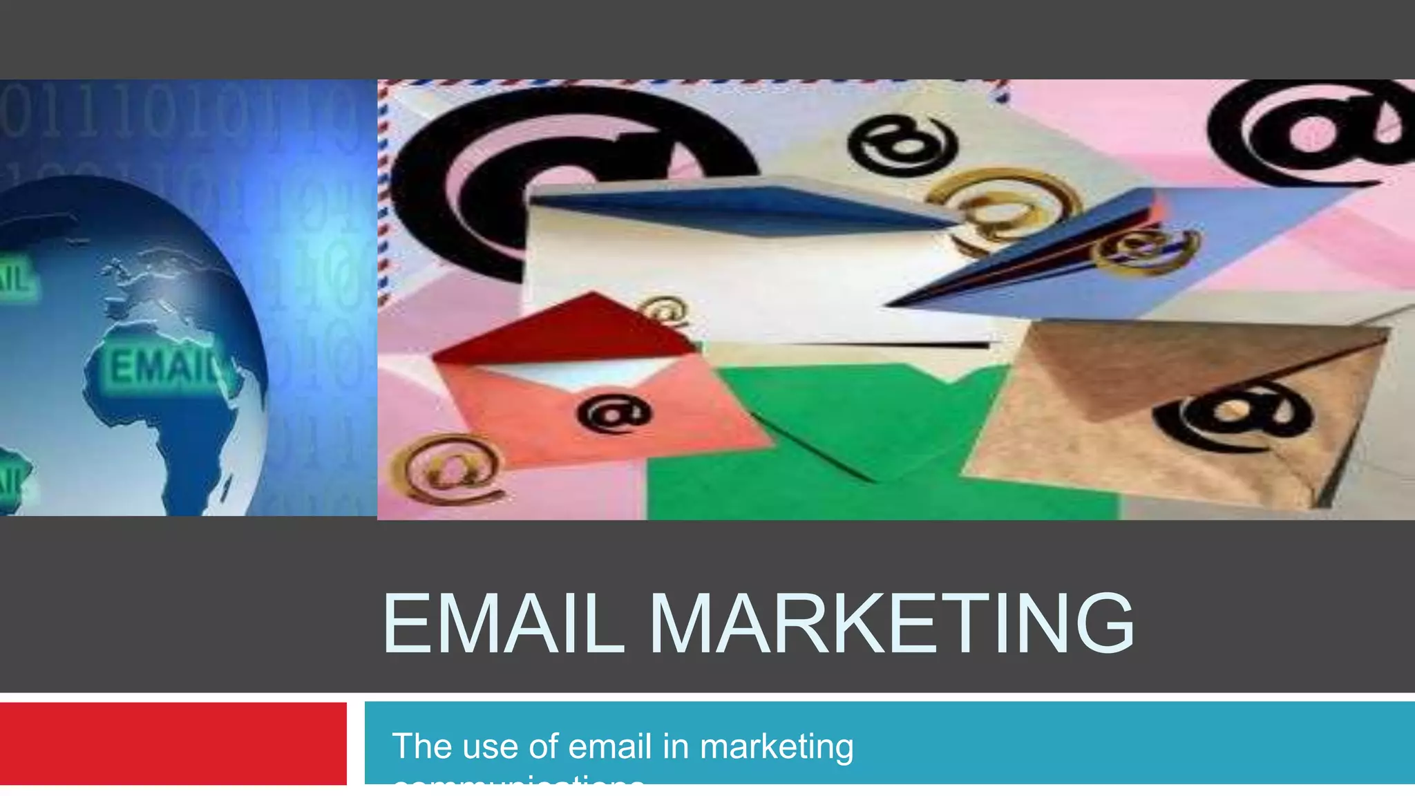Email marketing involves directly marketing commercial messages via email. It can be used to build loyalty, trust or brand awareness. Some key benefits include being quicker and cheaper than other forms of communication, allowing targeting of users according to their preferences, and enabling immediate tracking of results. Common objectives of email marketing include promoting new products, increasing brand patronage and loyalty, and driving immediate buying actions.