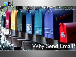 This email marketing getting started guide provides tips for new email marketers. It recommends sending email for lead generation during economic downturns. It stresses using email service providers, ensuring high deliverability, using good design practices, and growing an email list. The guide suggests focusing on choosing a service provider, deliverability, design, and growing subscriber lists to succeed with email marketing.