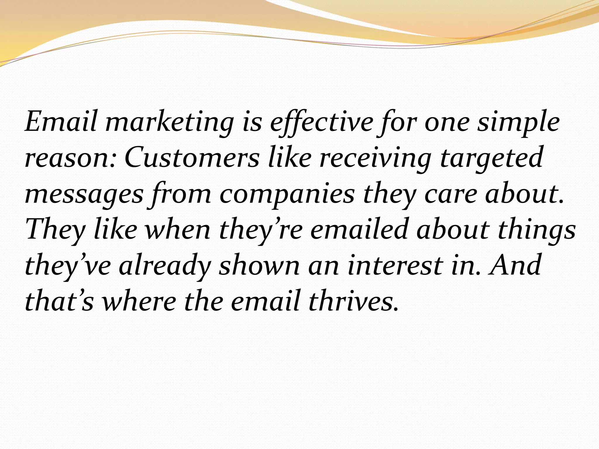 Email marketing is centered on engaging customers with targeted content that aligns with their interests, fostering strong relationships and customer retention. To succeed, businesses should ensure messages are personalized, well-formatted, consistent, and professional, thereby enhancing brand trust. Additionally, incorporating engaging subject lines and encouraging social media interaction can further expand customer interest and participation.
