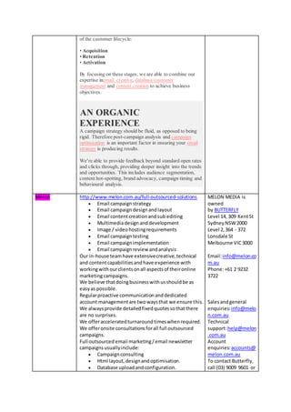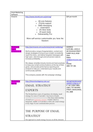 The document provides information on various email marketing service providers, outlining their offerings which typically include services such as email strategy, campaign design, list segmentation, analytics and reporting. The services are aimed at helping businesses improve the performance of their email marketing programs through professional management and optimization of campaigns, lists and automation. Pricing ranges from $20 per month for basic services up to consulting packages in the thousands for more comprehensive support.