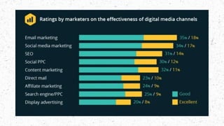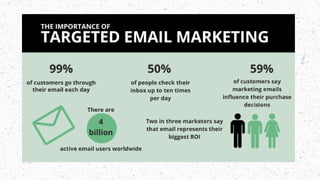 Email marketing is a direct marketing channel that allows businesses to communicate with customers about new products, updates, and promotions, offering high ROI and low costs. It reaches a vast global audience and is more effective than other digital marketing channels, with 3.9 billion users expected to grow to 4.3 billion. Key components of successful email marketing include a good platform, a targeted mailing list, engaging content, and analytics to measure effectiveness.