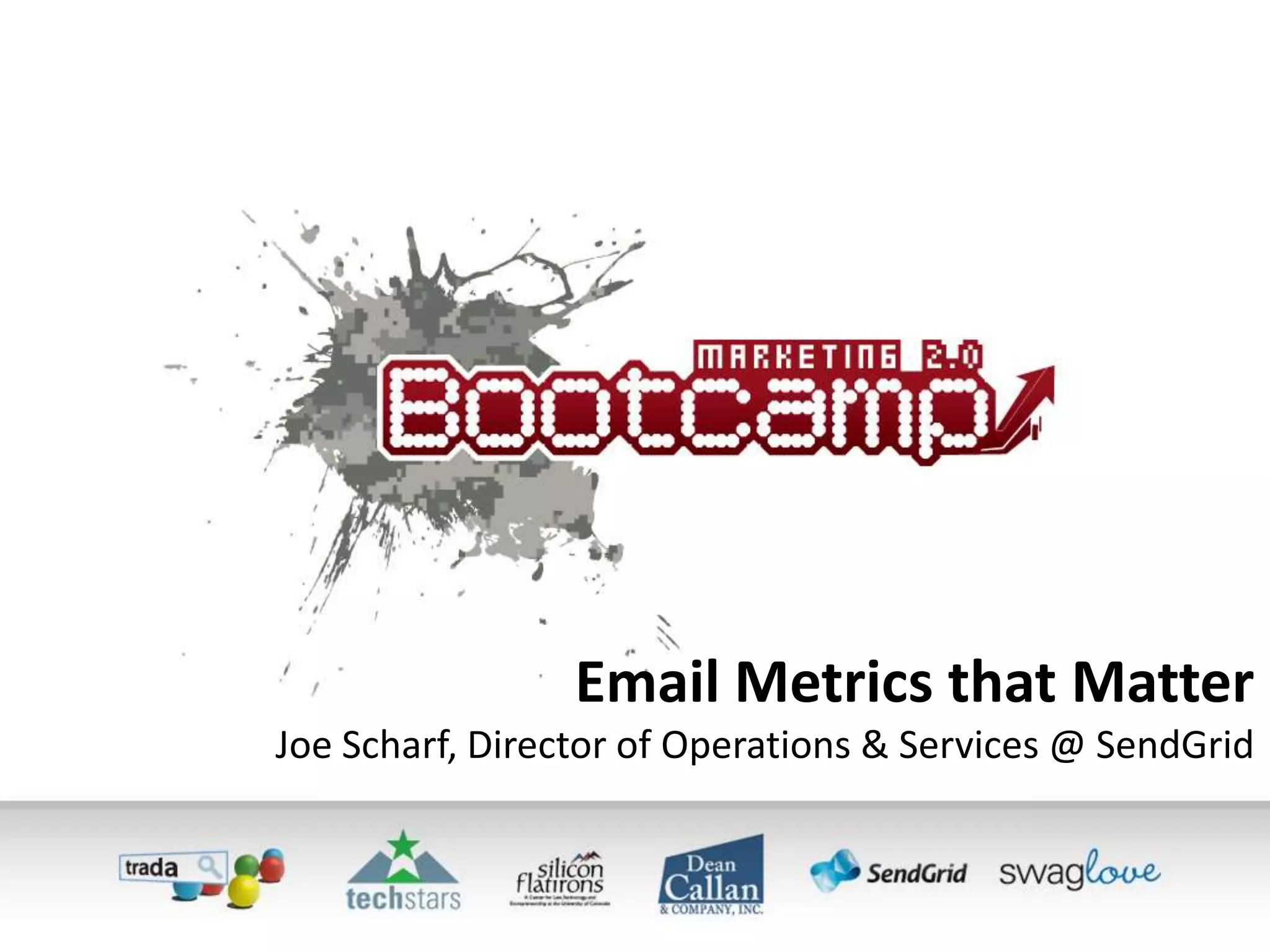 The document outlines key email metrics crucial for evaluating email campaign performance, including deliverability, open rates, click rates, bounces, and spam reports. It provides benchmarks for each metric to classify performance as great, good, or poor, and emphasizes the importance of engagement and sender reputation for successful email marketing. Additionally, it discusses compliance with regulations and the impact of email list quality on deliverability.