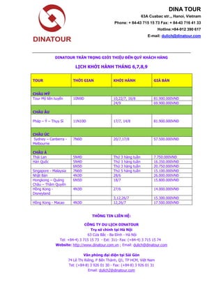 Dinatour giới thiệu lịch khởi hành và giá tour du lịch cho tháng 6 đến 9, 2023, bao gồm các điểm đến như Mỹ, Châu Âu, Châu Á, và Châu Úc. Giá tour đa dạng từ 7.750.000 VNĐ đến 81.900.000 VNĐ tùy thuộc vào địa điểm và thời gian. Thông tin liên hệ và chi tiết được cung cấp cho khách hàng qua các văn phòng tại Hà Nội và TP. Hồ Chí Minh.