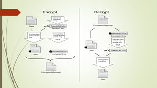 This document discusses email security concepts and PGP. It defines email security as securing email accounts and content. Techniques mentioned include strong passwords, spam filters, and encryption. Threats to email security are loss of confidentiality, integrity, and authentication. The document also discusses specific email security threats like snowshoe spamming, hacktivism, and data breaches. It defines concepts related to PGP like public/private key encryption and how PGP can be used to encrypt emails and files.