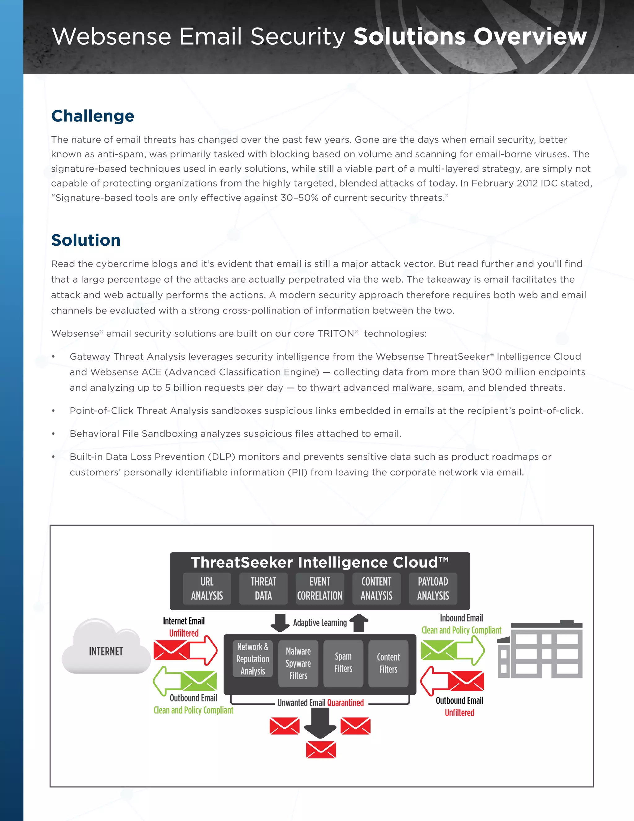 Websense offers several email security solutions to address modern threats. Their solutions leverage the Websense ThreatSeeker Intelligence Cloud and Advanced Classification Engine (ACE) to detect known and unknown malware, spam, and targeted attacks. Key capabilities include gateway threat analysis, point-of-click URL sandboxing, behavioral file sandboxing, and built-in data loss prevention. Websense solutions can be deployed in the cloud, on-premises with appliances, or in a hybrid model.