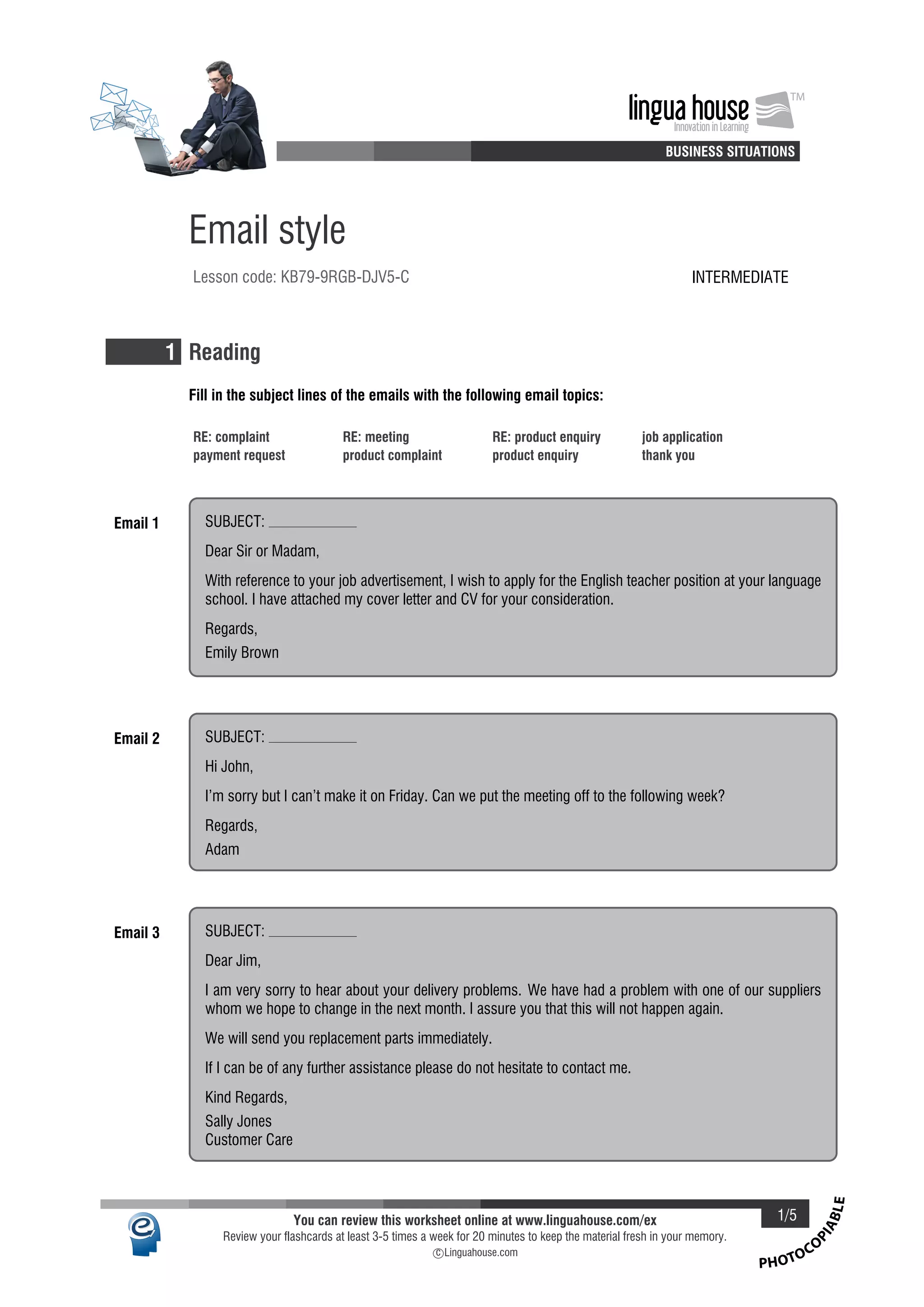 The document provides an English language lesson on email style. It contains examples of formal, informal and neutral emails and examines appropriate language styles. Students are asked to identify language features, match informal and formal synonyms, and rewrite sentences in different styles. The lesson concludes with a writing exercise where students must compose formal and informal emails based on given topics.