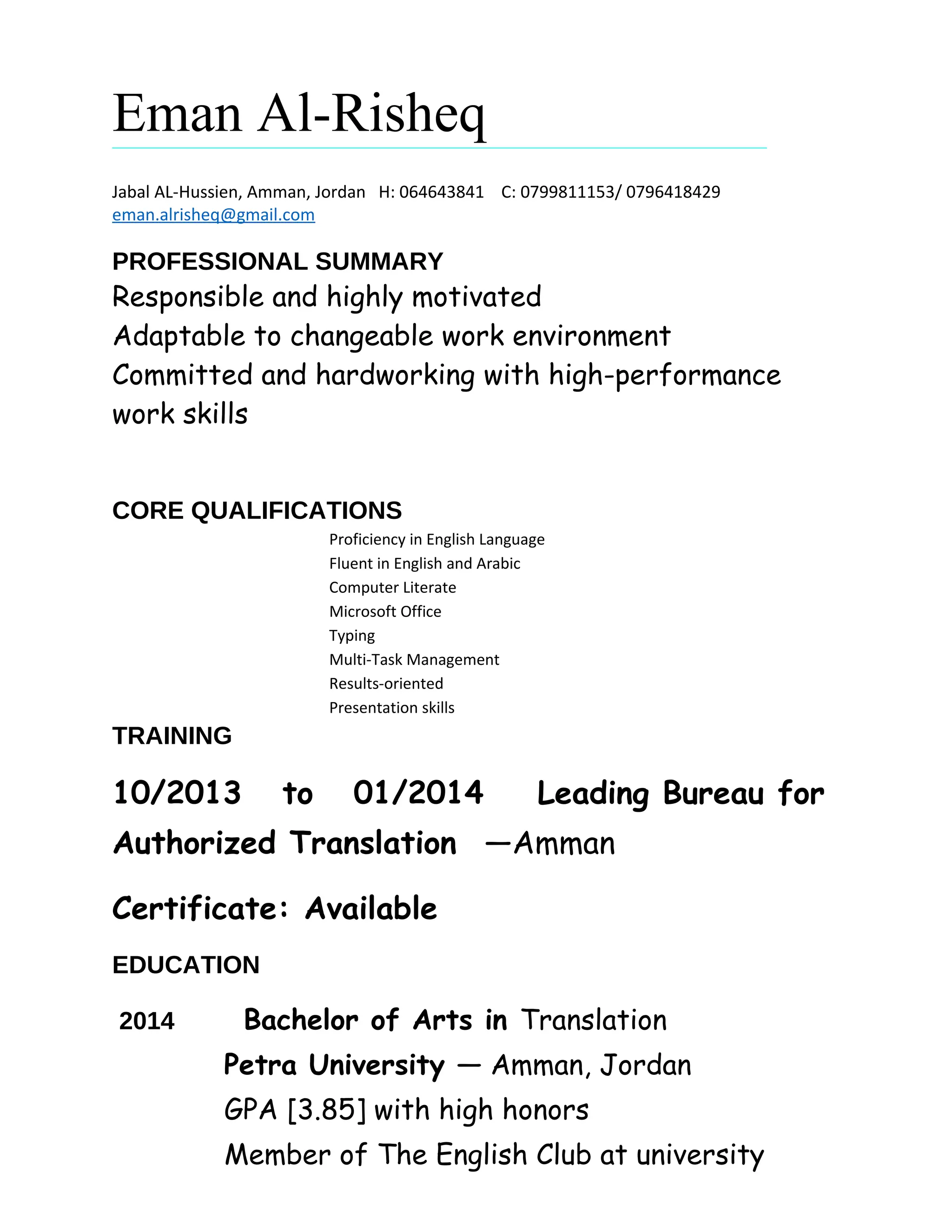 Eman Al-Risheq is seeking a position and has over 10 years of experience in translation and teaching English. She received a Bachelor's degree in translation from Petra University in 2014 with high honors and is fluent in both English and Arabic. Her previous roles include working as an English instructor at the Modern Language Center since November 2014 and doing translation work at the Leading Bureau for Authorized Translation from 2013 to 2014. She has strong computer, presentation, and multi-tasking skills.