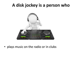The document defines various occupations and the people who work in those roles, including a butcher who sells meat, a disk jockey who plays music, and a fashion designer who creates new clothing. It also describes jobs such as a lawyer who helps with legal issues, a soldier in the army, and a pharmacist who provides medicine. A variety of other occupations are outlined such as a greengrocer selling produce, a baker making bread, a sailor on a boat, and a teacher who educates people.