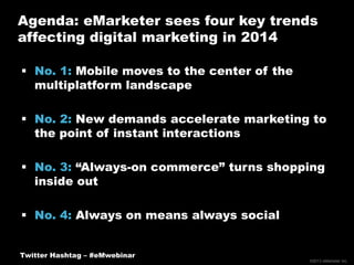 The document outlines four key digital marketing trends for 2014, emphasizing the centrality of mobile devices, the need for instant interactions, the transformation of shopping through 'always-on commerce', and the importance of social media in engaging consumers. It highlights the shift towards mobile-first strategies and the necessity for marketers to adapt quickly to consumer behaviors and preferences in a digitally connected world. The report also stressed the growing reliance on data and the integration of marketing channels to enhance consumer engagement.