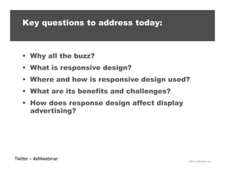 The document discusses responsive design as a method for optimizing content delivery across various devices, highlighting its growing relevance due to increasing mobile traffic and device fragmentation. It outlines the benefits, such as easier maintenance and improved user experience, along with challenges in implementing responsive design in advertising. Additionally, it emphasizes the need for adaptable ad serving systems to fully leverage the advantages of responsive design in marketing.