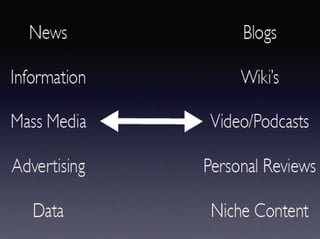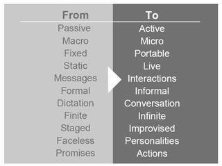 The document discusses integrated marketing communication (IMC) and how marketers can use various online and offline communication tools. It provides an overview of IMC principles and characteristics. It then describes how internet marketing communications differ from traditional methods in terms of interactivity, personalization, and other factors. Finally, it outlines several online communication tools marketers can use, including advertising, public relations, direct marketing, and how to evaluate an IMC campaign.