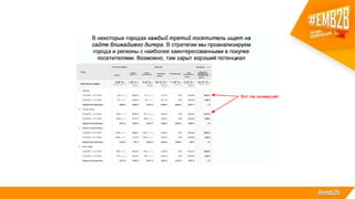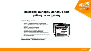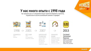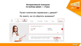 Документ описывает процесс построения системы электронного маркетинга для крупного российского производителя, завода стальных дверей Torex. Основное внимание уделяется разработке и интеграции нового сайта, который решает множество бизнес-задач, включая автоматизацию продаж, анализ спроса и улучшение взаимодействия с клиентами. Также рассматриваются результаты внедрения системы, такие как рост органического трафика и снижение показателя отказов на сайте.